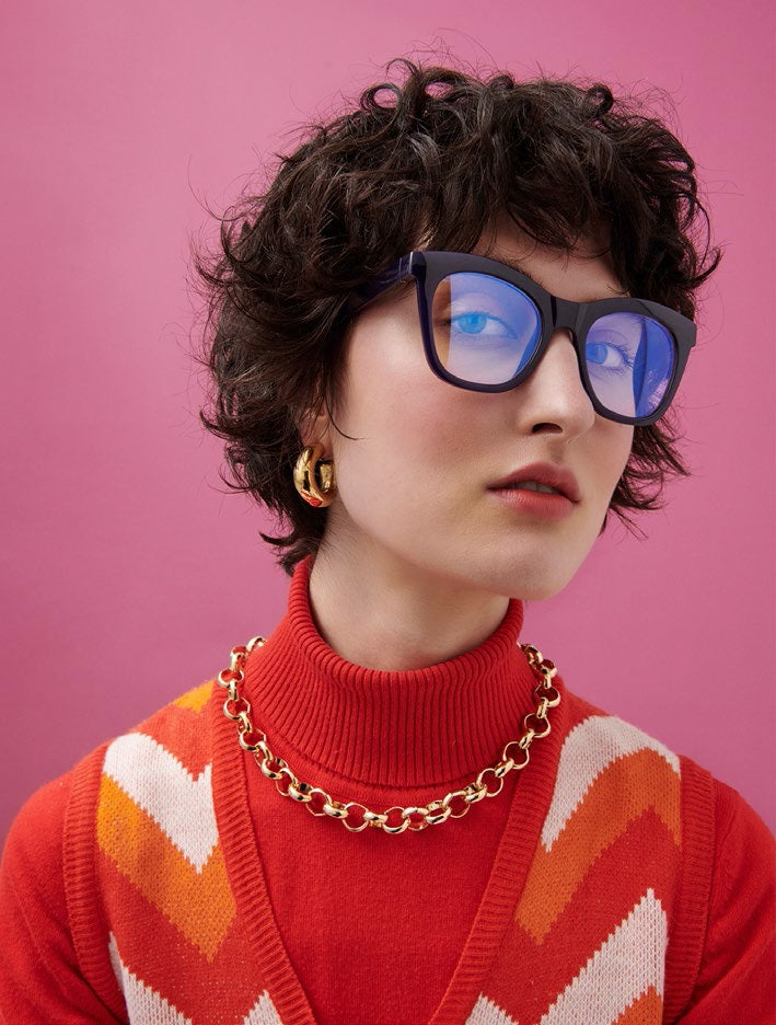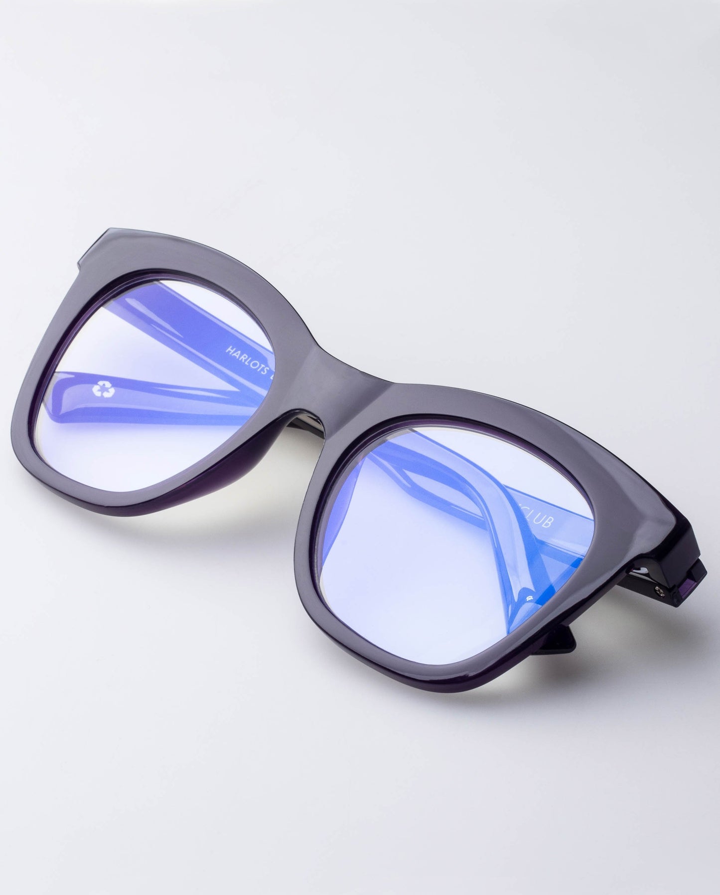 Eye 51 / Bridge 21 / Temple 143 ♻ Recyclable and BPA-free material ♻ Harlot's bed is a positive and playful statement frame. The oversize styling in a lustrous dark purple is an easy wear, with it's flexible, recyclable bpa-free material providing comfort and good feels. Available in ready-to go magnifications if you require reading glasses and blue screen lens options which cuts up to 30% of blue light emitted from digital devices.